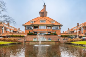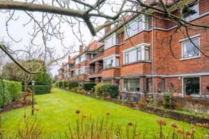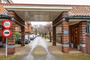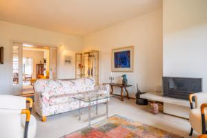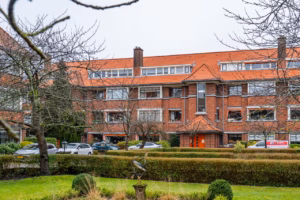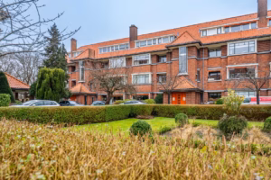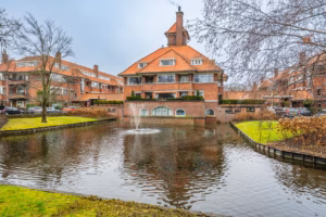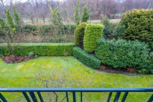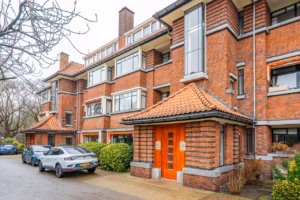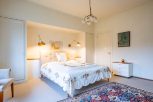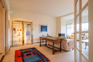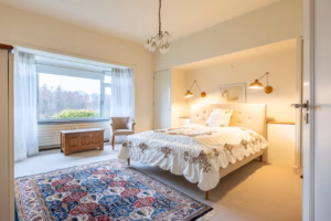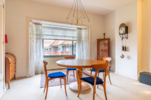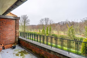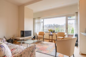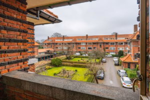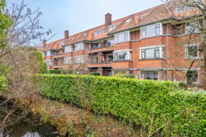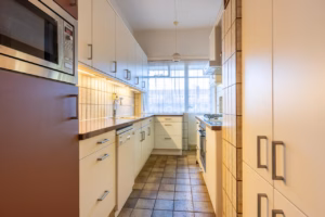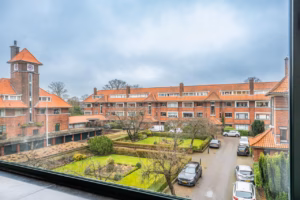 The living room, with a fireplace and access to the spacious balcony with evening sun, offers a beautiful and unobstructed view of the greenery towards Duindigt. The authentic en-suite sliding doors with practical built-in cupboards have been retained.