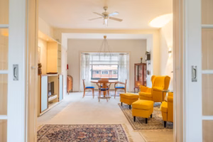The dining room is located at the front of the apartment, overlooking the park.