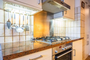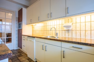 Separate kitchen with access to the second balcony at the front. The kitchen is equipped with all desirable built-in appliances, including an oven, microwave, dishwasher, gas cooktop, extractor hood, and fridge-freezer.