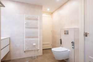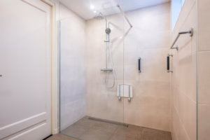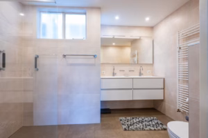 A spacious, modern bathroom with a walk-in shower, wall-mounted toilet, and double vanity. The bathroom is accessible from both the bedroom and the hallway.