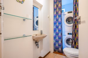 Hallway with the meter cupboard and access to the guest toilet with a small sink. The new washing machine and dryer are conveniently concealed in a storage cupboard.