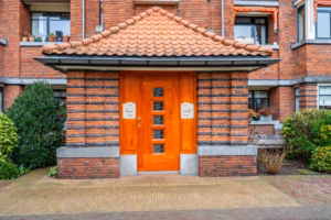 Layout: Entrance through an authentic porch with mailboxes and a doorbell panel. A beautiful staircase or elevator leads to the second floor. A separate indoor entrance leads to the apartment.